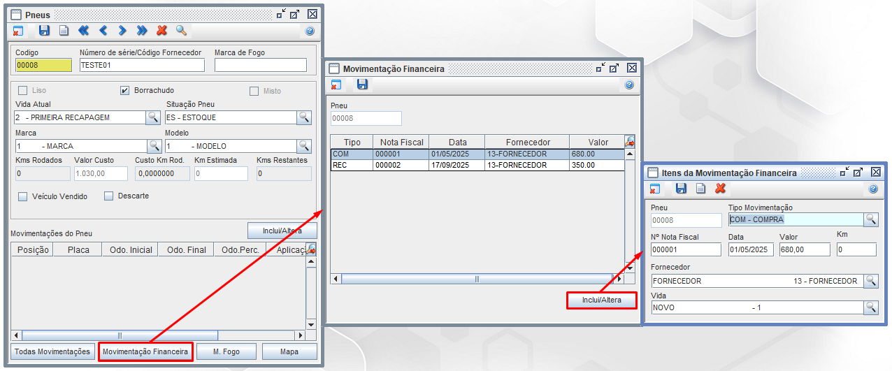 Para a inclusão de uma Movimentação Financeira referente ao pneu, basta acessar a opção "Movimentação Financeira" na parte baixa do diálogo, acessando a opção um diálogo será aberto mostrando um grid com todas as informações de movimentação financeira, clicando no botão "Inclui/Altera", um outro novo diálogo será aberto possibilitando a inclusão de uma movimentação financeira.